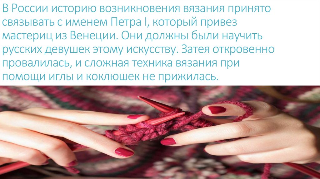 В России историю возникновения вязания принятосвязывать с именем Петра I, который привез