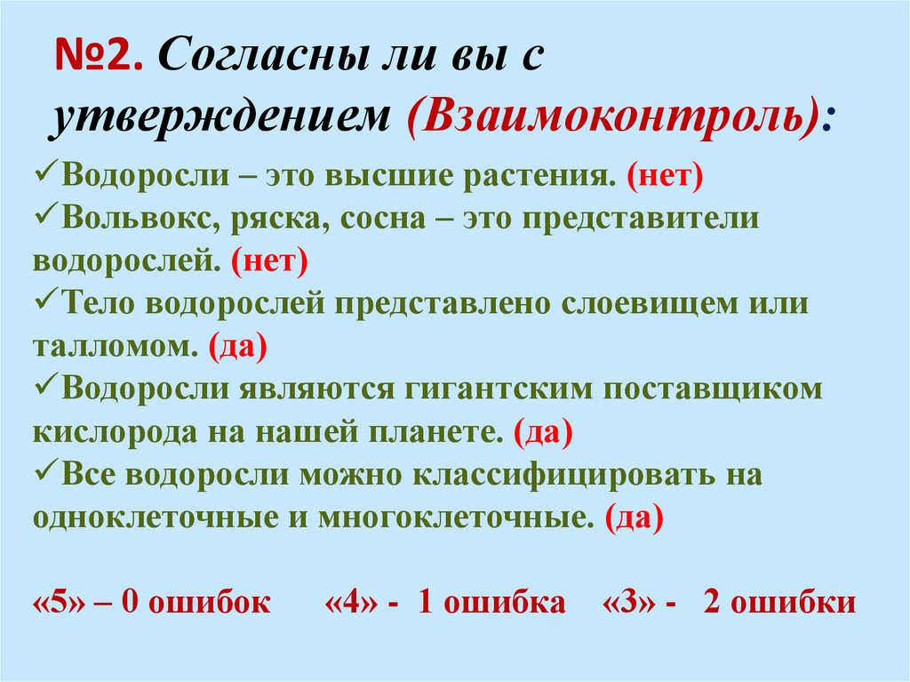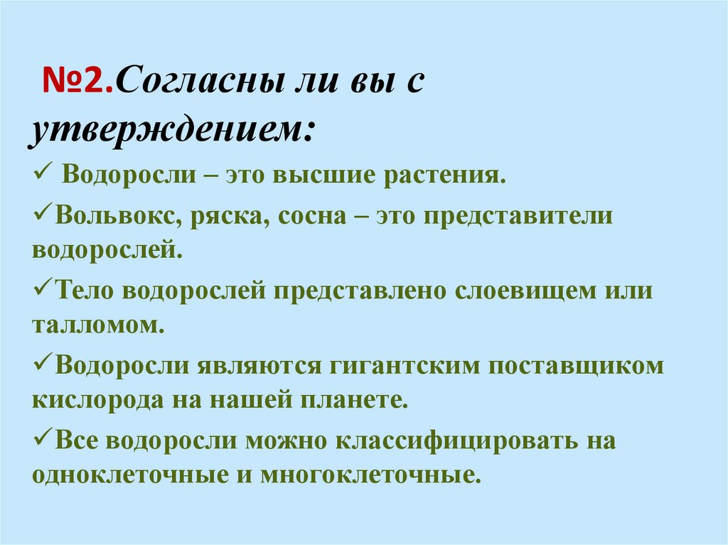 Водоросли – это высшие растения. (нет)