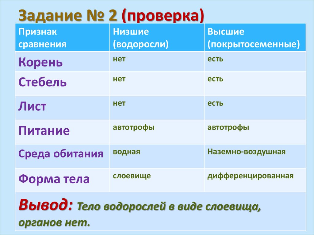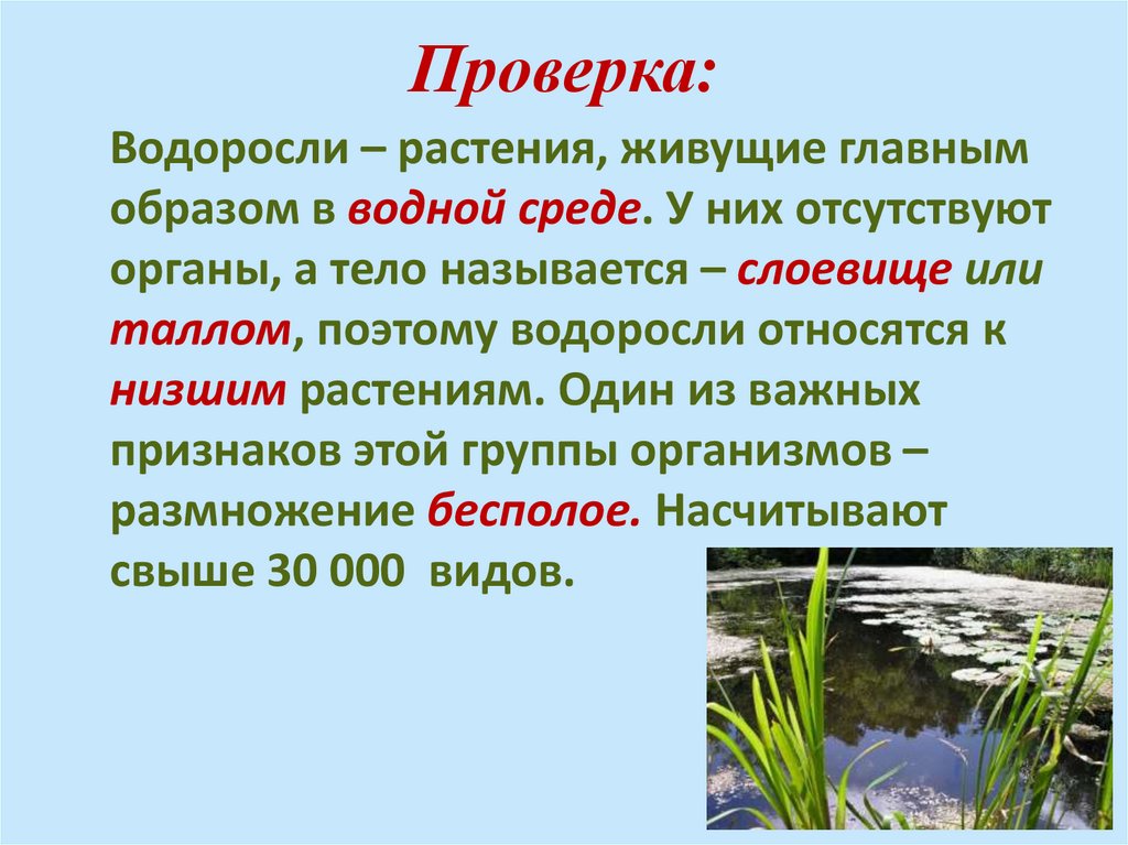Проверка:Водоросли – растения, живущие главным