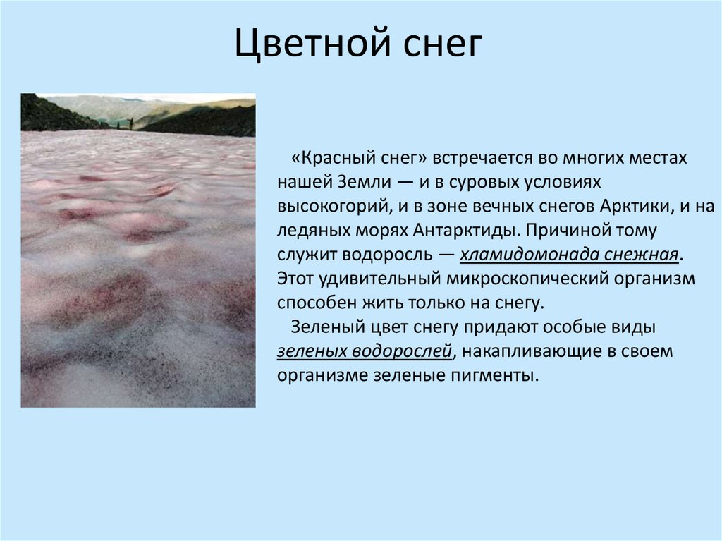 Цветной снег«Красный снег» встречается во многих местах