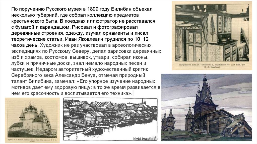 По поручению Русского музея в 1899 году Билибин объехалнесколько губерний, где собрал коллекцию предметов