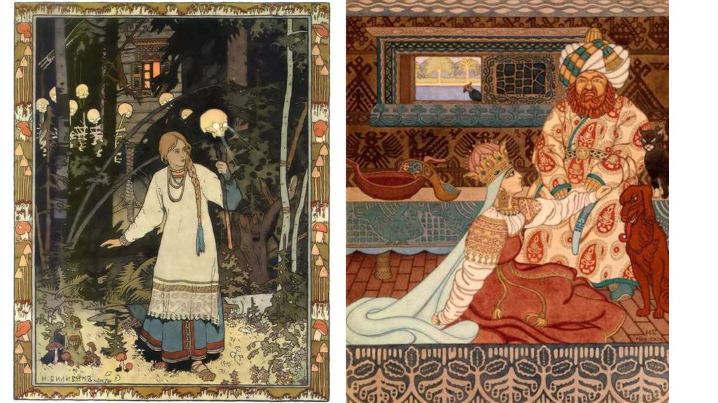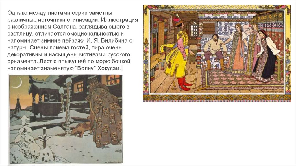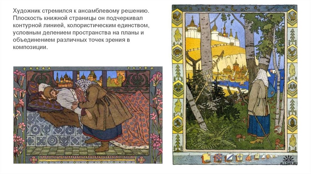 стилистически выверенном билибинском мире сказка сливается с образами русской старины и природы. Билибин