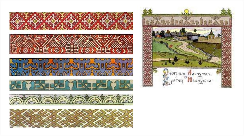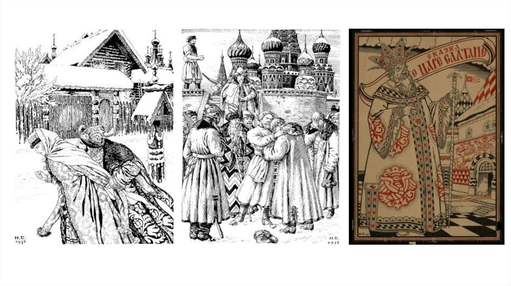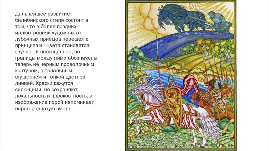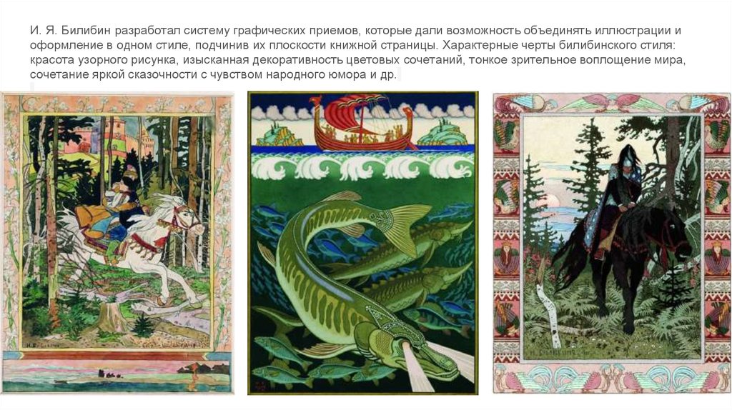 И. Я. Билибин разработал систему графических приемов, которые дали возможность объединять иллюстрации иоформление в одном стиле, подчинив их плоскости книжной страницы. Характерные черты билибинского стиля: