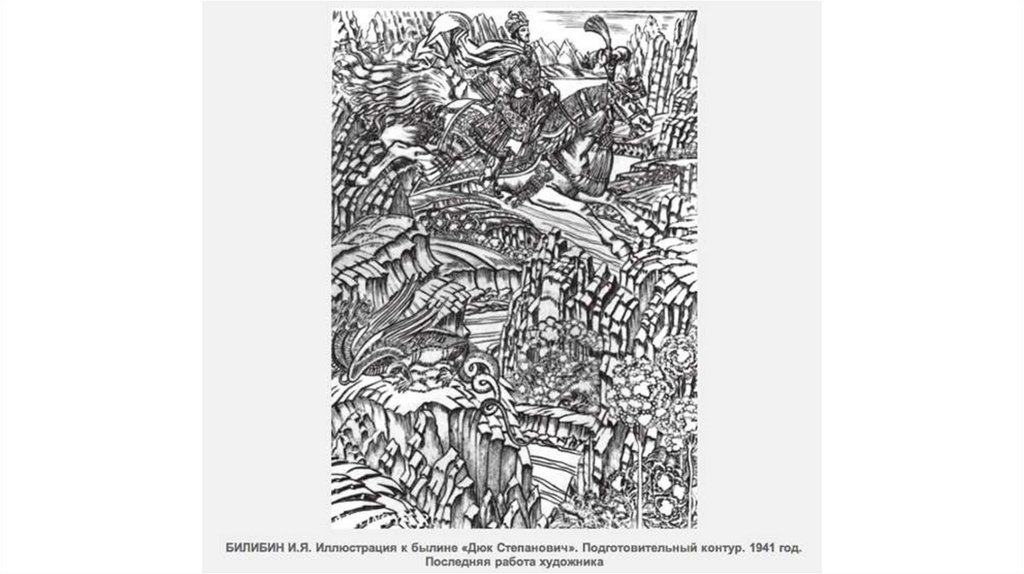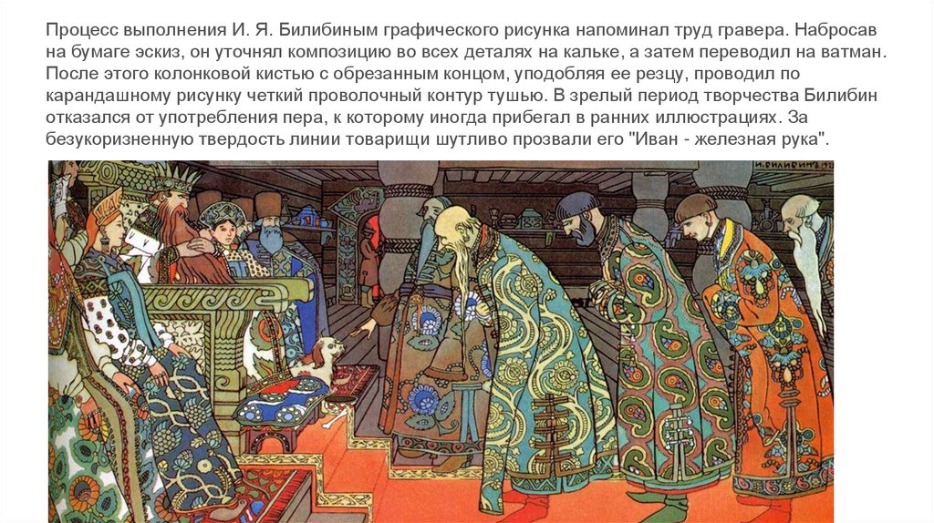 Процесс выполнения И. Я. Билибиным графического рисунка напоминал труд гравера. Набросавна бумаге эскиз, он уточнял композицию во всех деталях на кальке, а затем переводил на ватман.