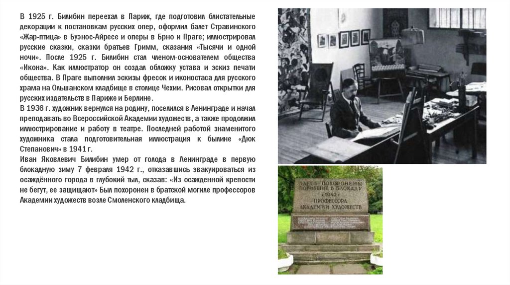 В 1925 г. Билибин переехал в Париж, где подготовил блистательныедекорации к постановкам русских опер, оформил балет Стравинского