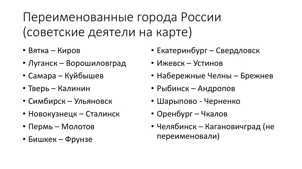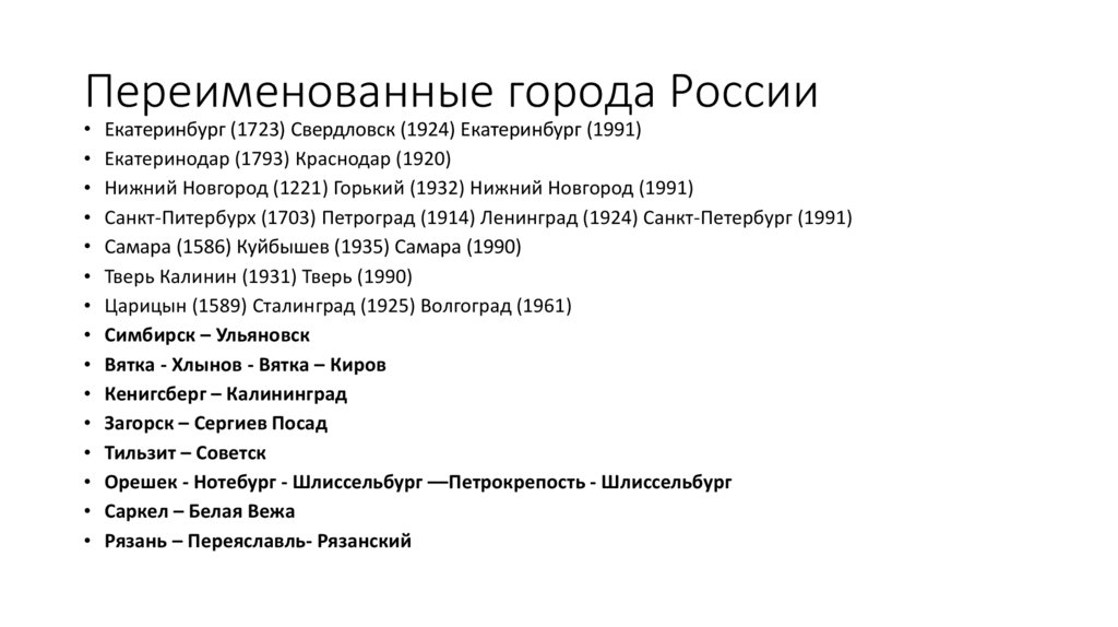 Переименованные города РоссииЕкатеринбург (1723) Свердловск (1924) Екатеринбург (1991)