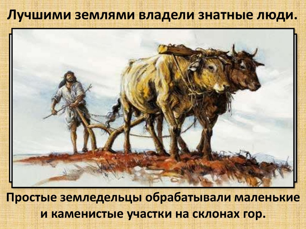 Лучшими землями владели знатные люди.Простые земледельцы обрабатывали маленькие