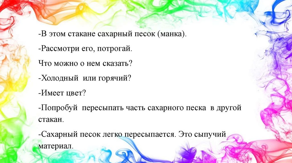-В этом стакане сахарный песок (манка).-Рассмотри его, потрогай.