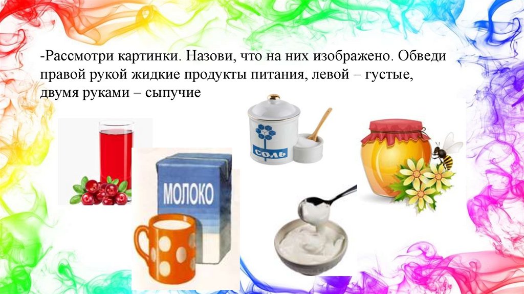 -Рассмотри картинки. Назови, что на них изображено. Обведиправой рукой жидкие продукты питания, левой – густые,