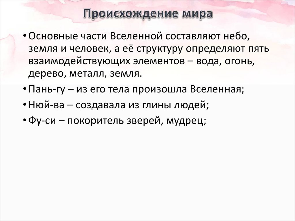 • Основные части Вселенной составляют небо,земля и человек, а её структуру определяют пять