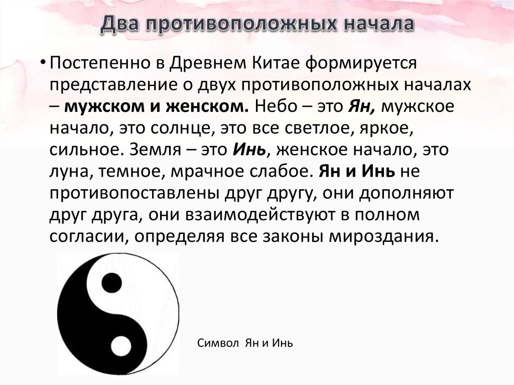 • Постепенно в Древнем Китае формируетсяпредставление о двух противоположных началах