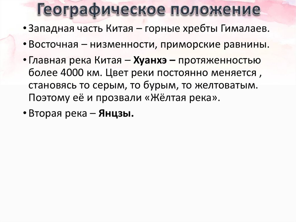 • Главная река Китая – Хуанхэ – протяженностью