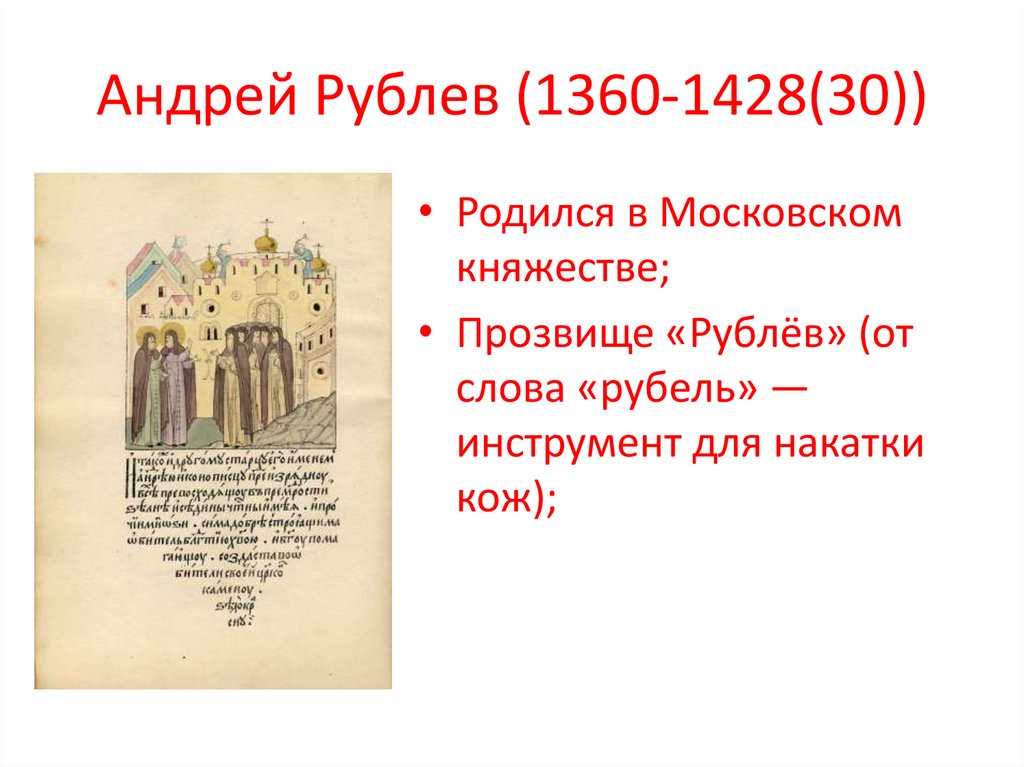 Андрей Рублев (1360-1428(30))• Родился в Московском