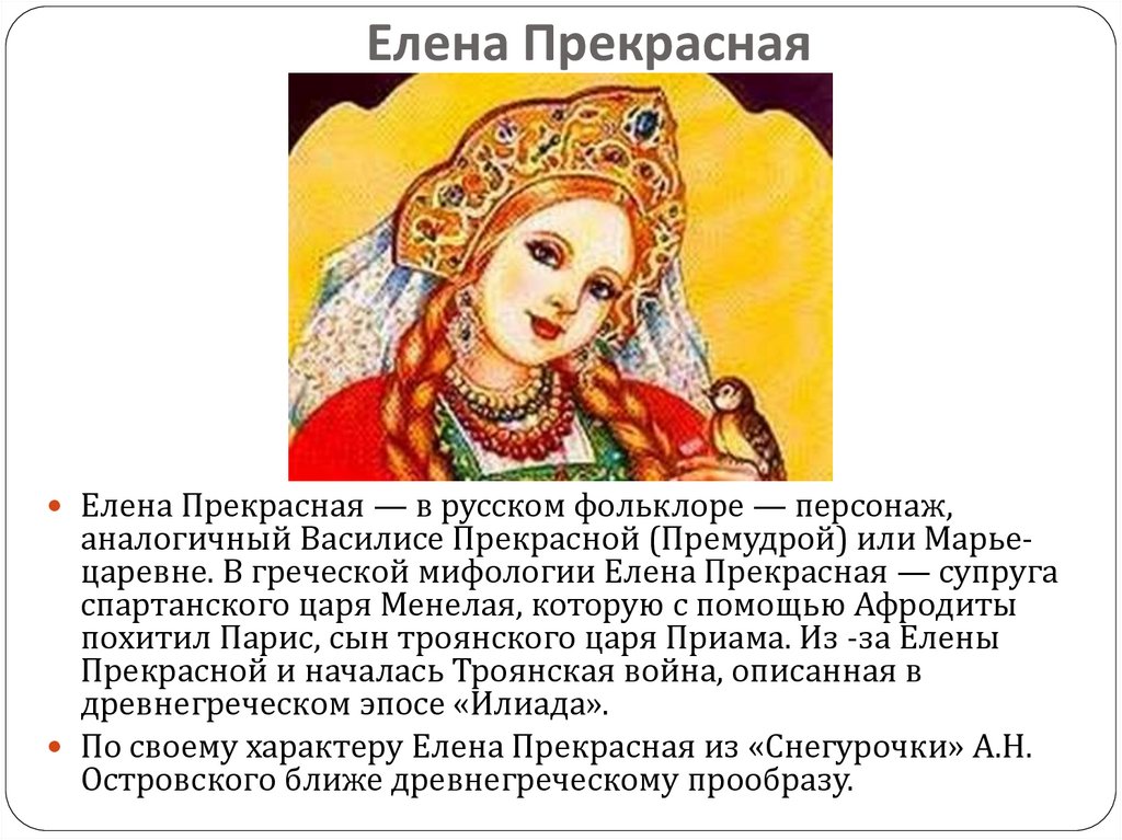 аналогичный Василисе Прекрасной (Премудрой) или Марьецаревне. В греческой мифологии Елена Прекрасная — супруга