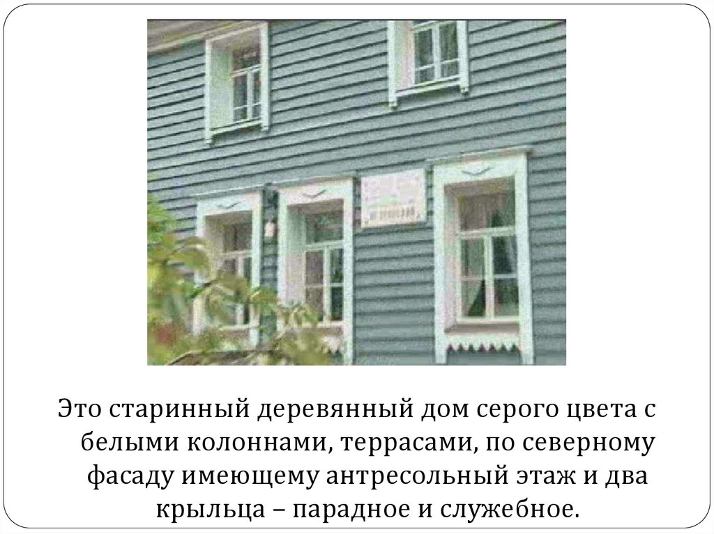 Это старинный деревянный дом серого цвета сбелыми колоннами, террасами, по северному