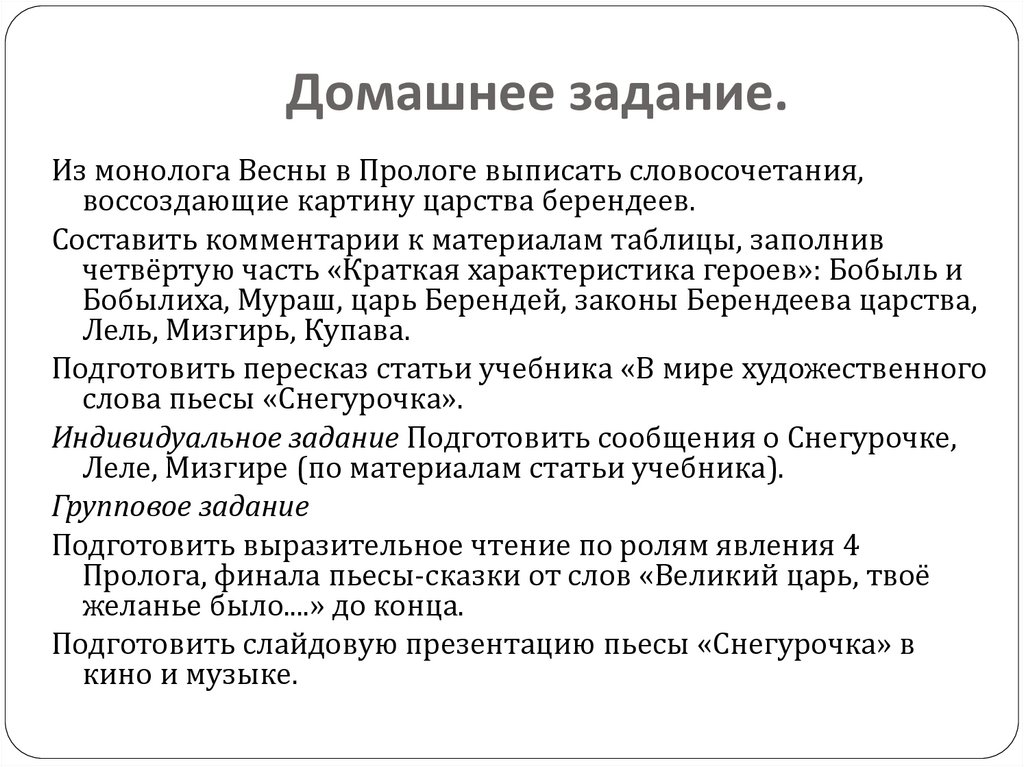 Подготовить слайдовую презентацию пьесы «Снегурочка» в
