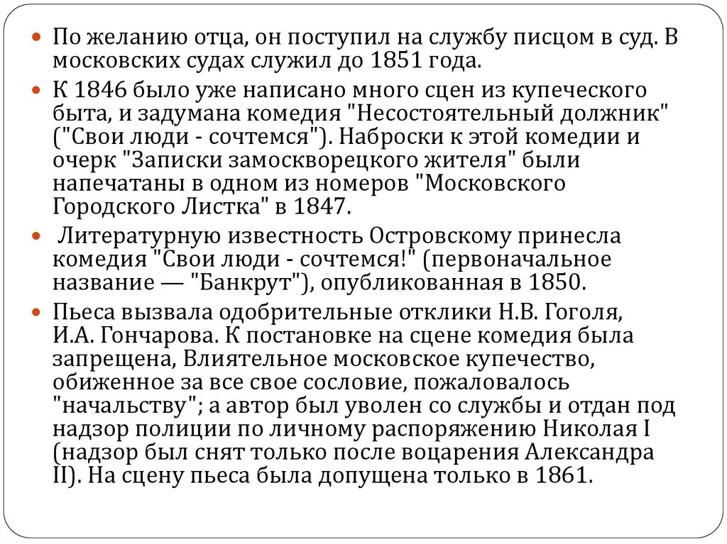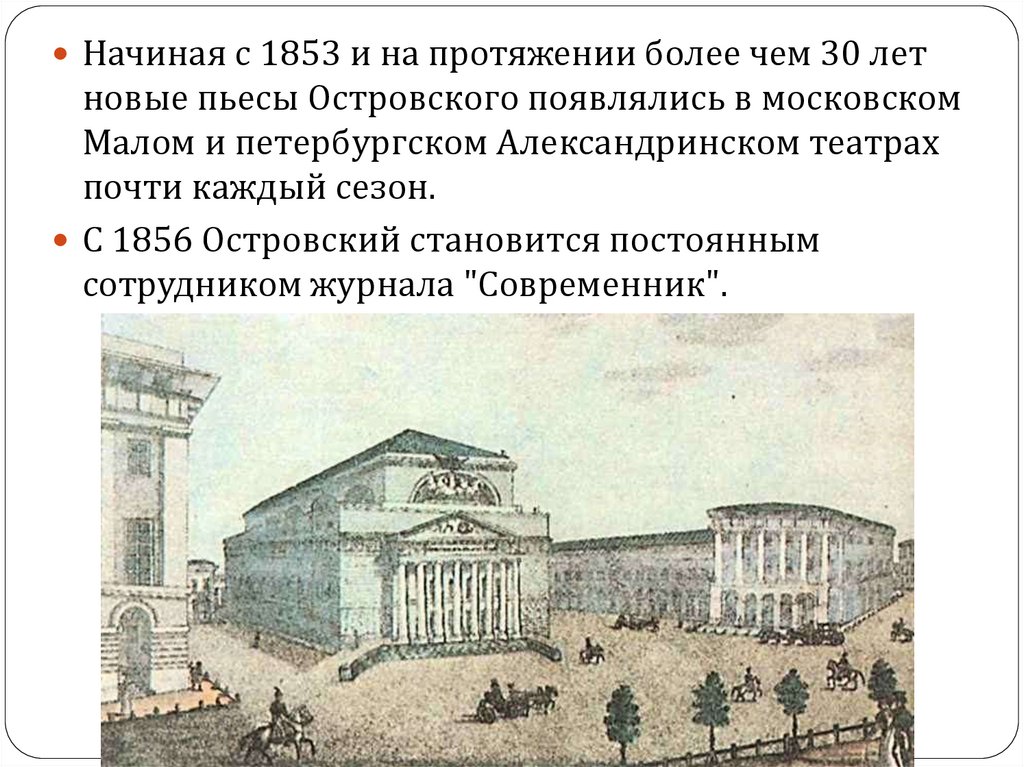 Начиная с 1853 и на протяжении более чем 30 летновые пьесы Островского появлялись в московском