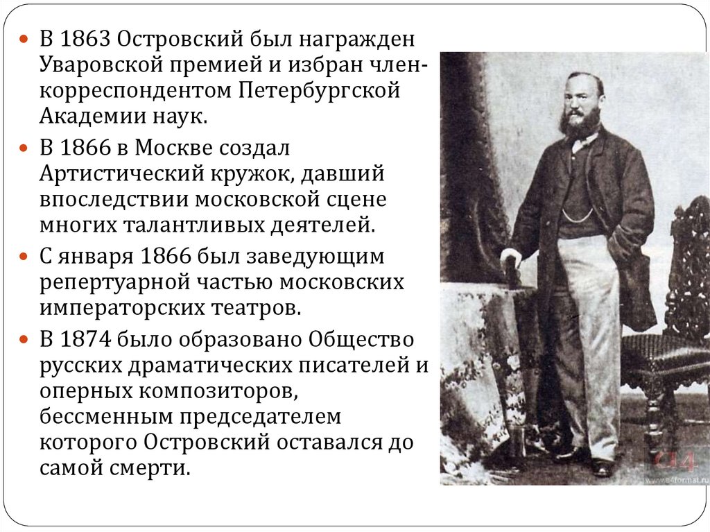 В 1863 Островский был награжденУваровской премией и избран членкорреспондентом Петербургской