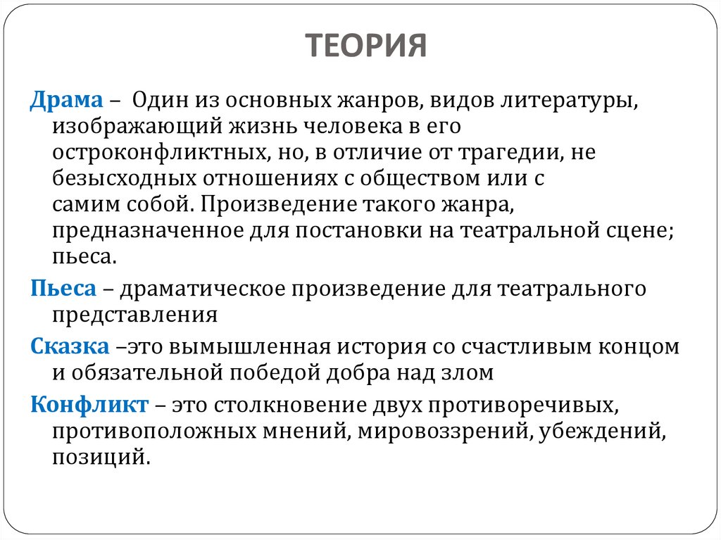 ТЕОРИЯДрама – Один из основных жанров, видов литературы,