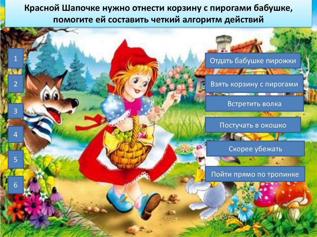 Красной Шапочке нужно отнести корзину с пирогами бабушке,помогите ей составить четкий алгоритм действий