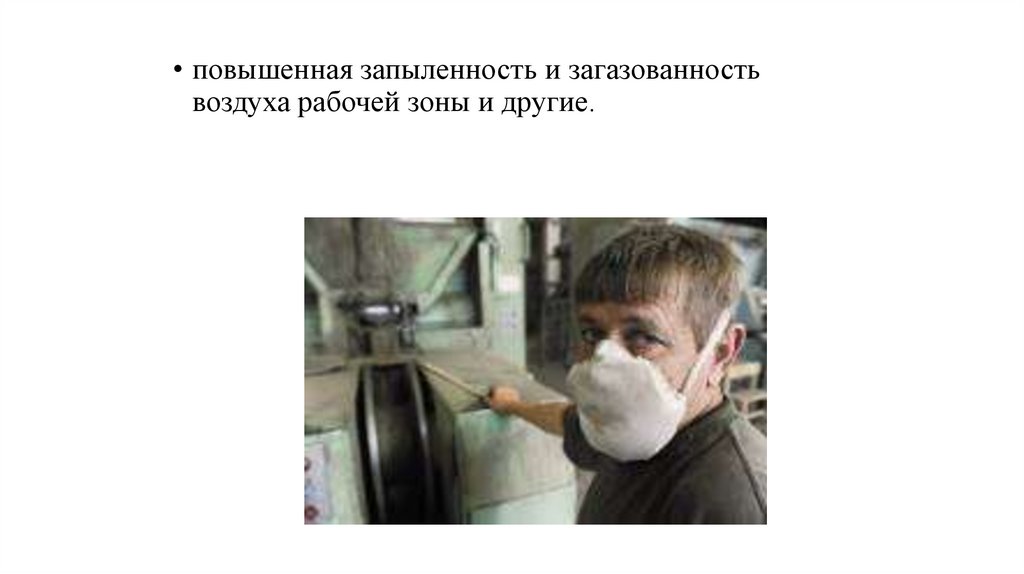• повышенная запыленность и загазованностьвоздуха рабочей зоны и другие.