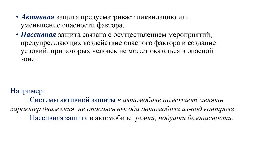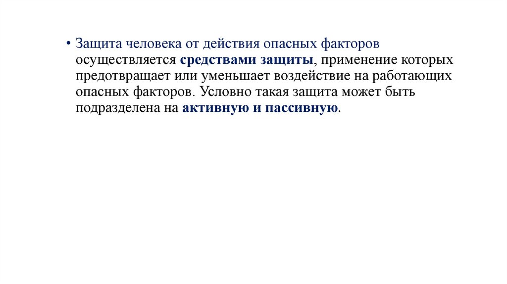 • Активная защита предусматривает ликвидацию илиуменьшение опасности фактора.