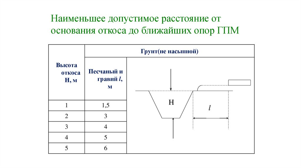 Наименьшее допустимое расстояние отоснования откоса до ближайших опор ГПМ