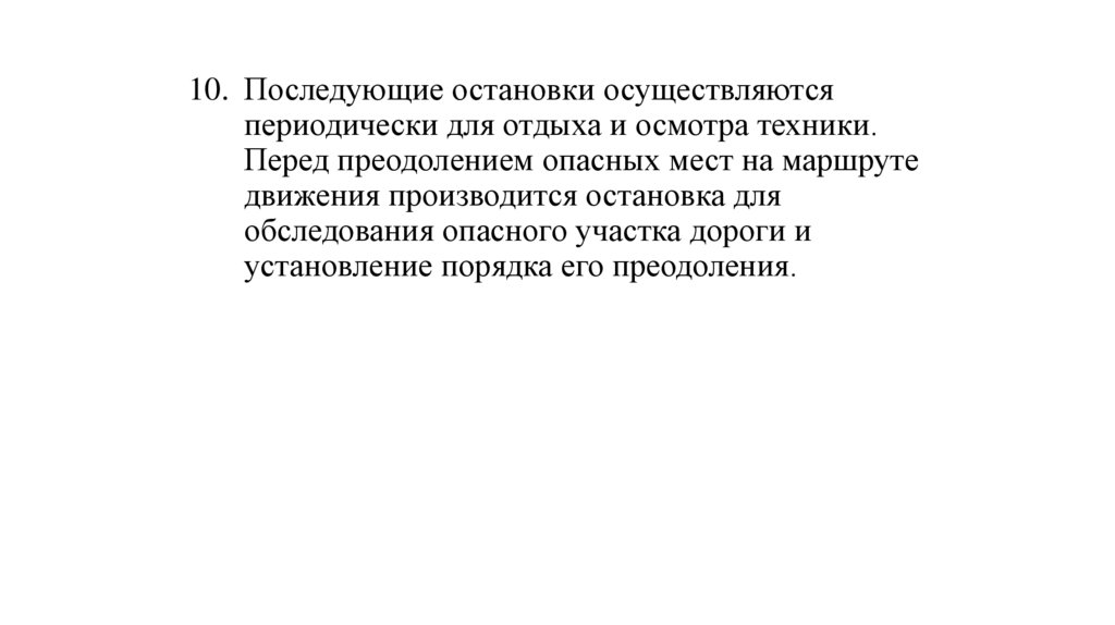 10. Последующие остановки осуществляютсяпериодически для отдыха и осмотра техники.