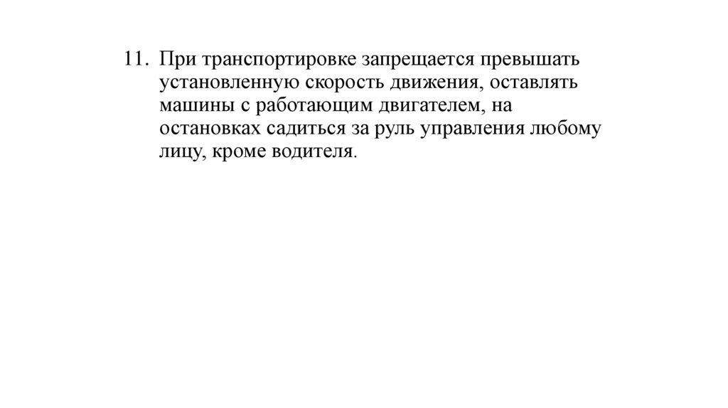 11. При транспортировке запрещается превышатьустановленную скорость движения, оставлять