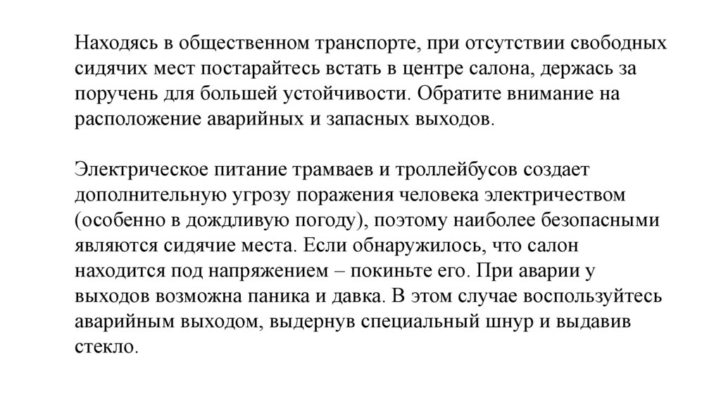 Находясь в общественном транспорте, при отсутствии свободныхсидячих мест постарайтесь встать в центре салона, держась за