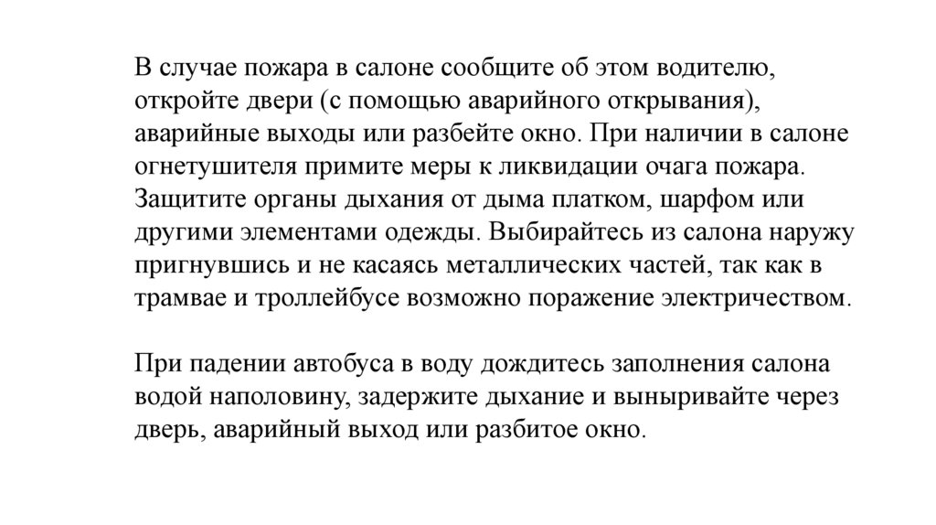 В случае пожара в салоне сообщите об этом водителю,откройте двери (с помощью аварийного открывания),