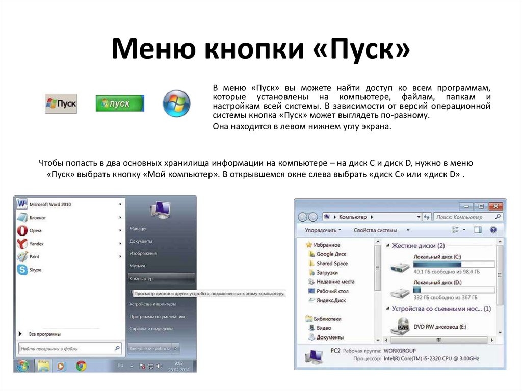 Чтобы попасть в два основных хранилища информации на компьютере – на диск С и диск D, нужно в меню