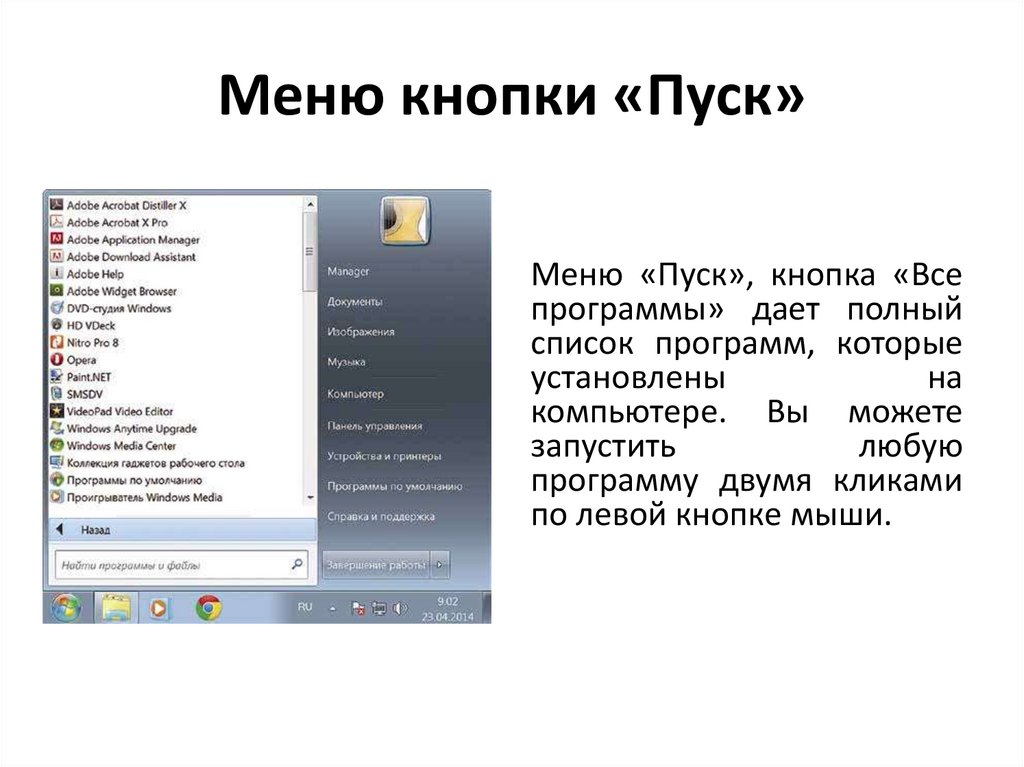 Меню кнопки «Пуск»В меню «Пуск» вы можете найти доступ ко всем программам,