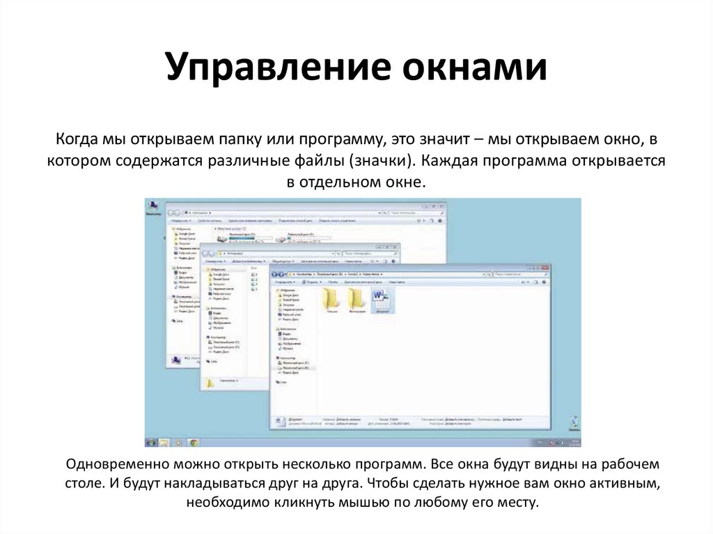 Управление окнамиКогда мы открываем папку или программу, это значит – мы открываем окно, в