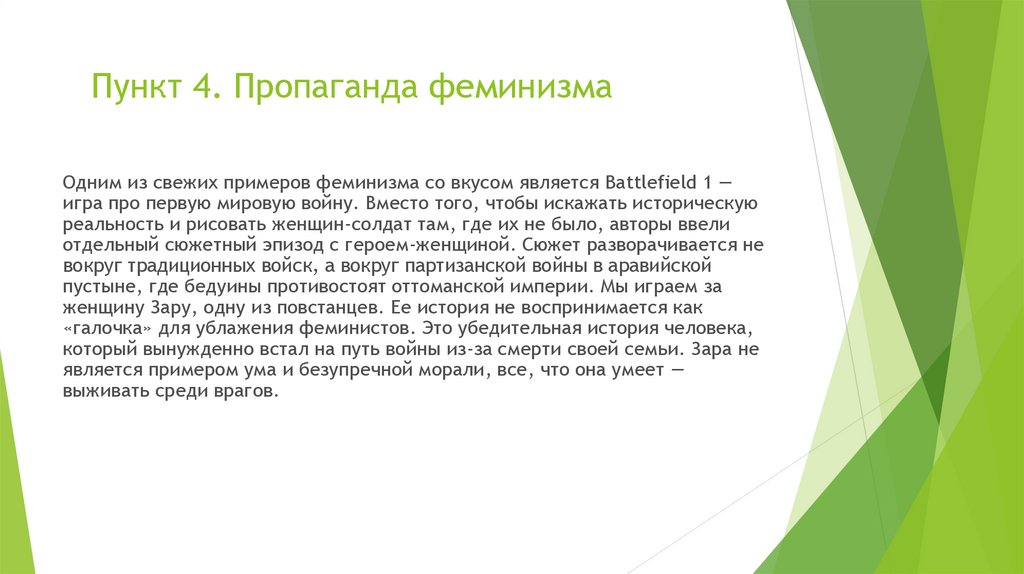 Пункт 4. Пропаганда феминизмаОдним из свежих примеров феминизма со вкусом является Battlefield 1 —
