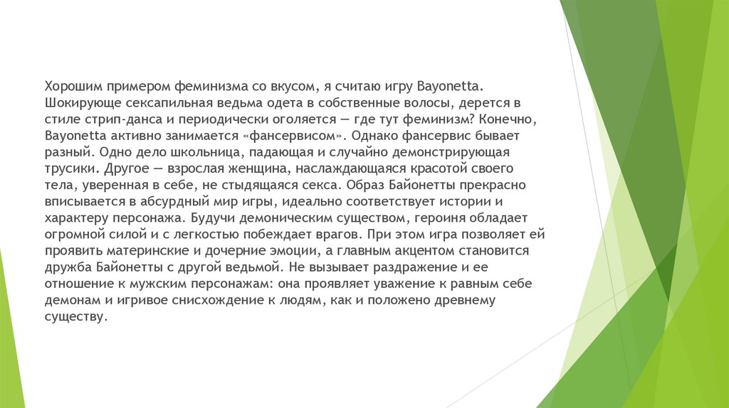 Хорошим примером феминизма со вкусом, я считаю игру Bayonetta.Шокирующе сексапильная ведьма одета в собственные волосы, дерется в