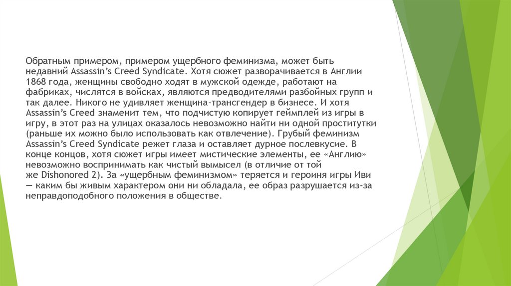 Обратным примером, примером ущербного феминизма, может бытьнедавний Assassin’s Creed Syndicate. Хотя сюжет разворачивается в Англии