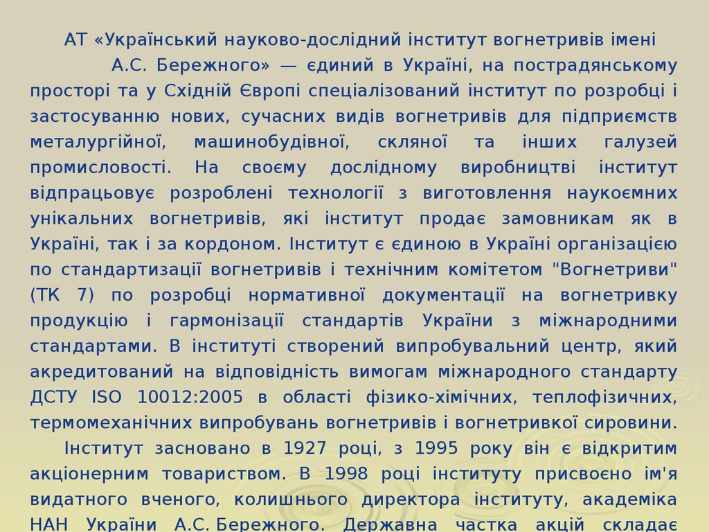АТ «Український науково-дослідний інститут вогнетривів іменіА.С. Бережного» — єдиний в Україні, на пострадянському