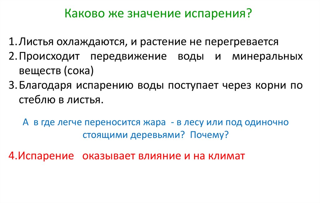 Каково же значение испарения?1.Листья охлаждаются, и растение не перегревается