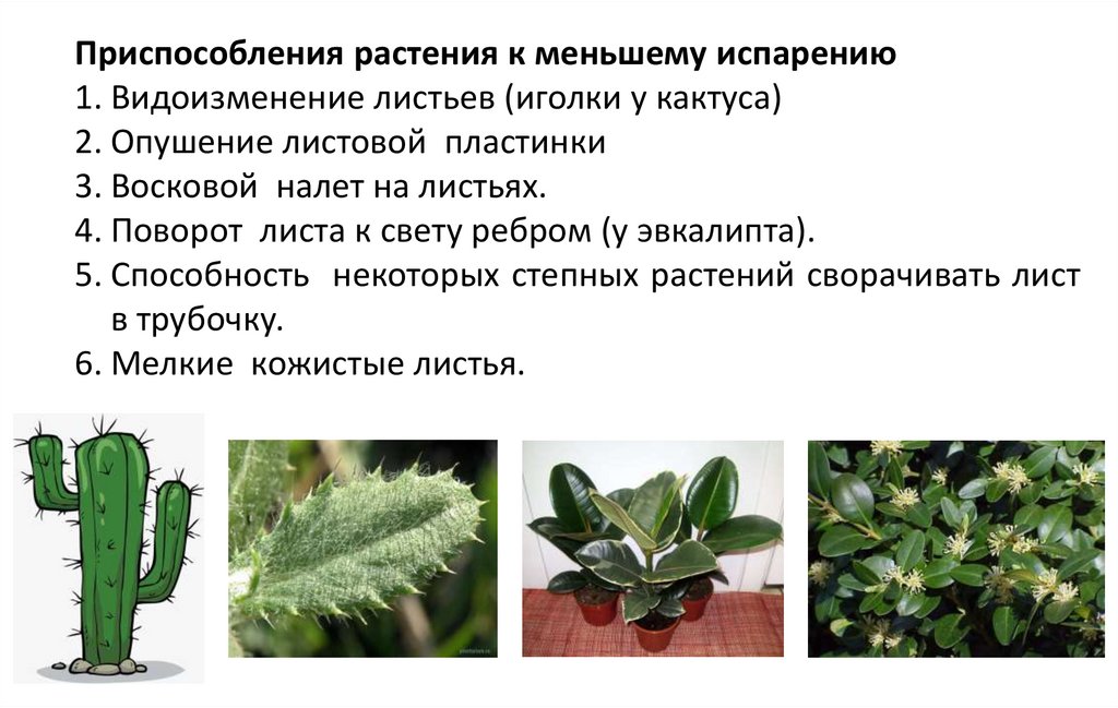 Приспособления растения к меньшему испарению1. Видоизменение листьев (иголки у кактуса)