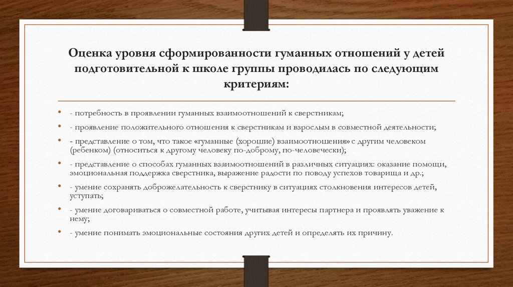 Оценка уровня сформированности гуманных отношений у детейподготовительной к школе группы проводилась по следующим