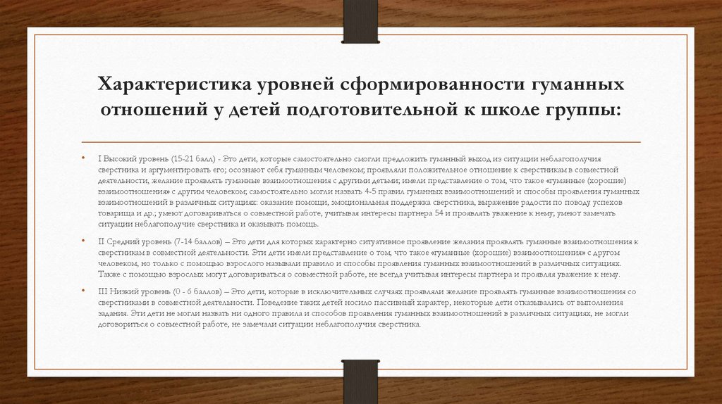 Характеристика уровней сформированности гуманныхотношений у детей подготовительной к школе группы: