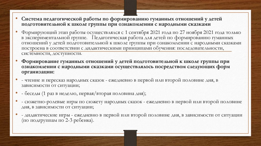 в экспериментальной группе. Педагогическая работа для детей по формированию гуманных