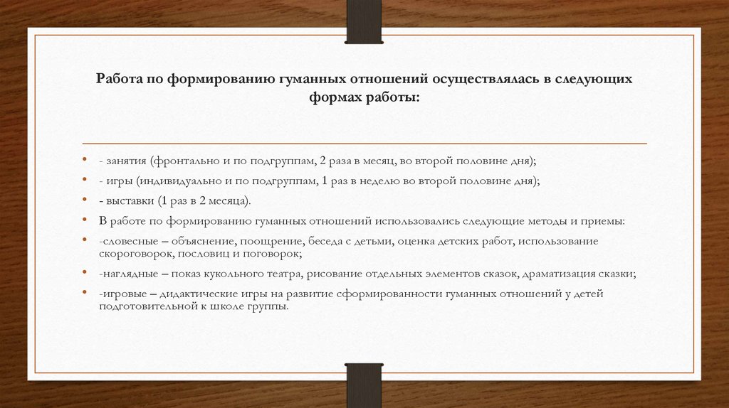 Работа по формированию гуманных отношений осуществлялась в следующихформах работы: