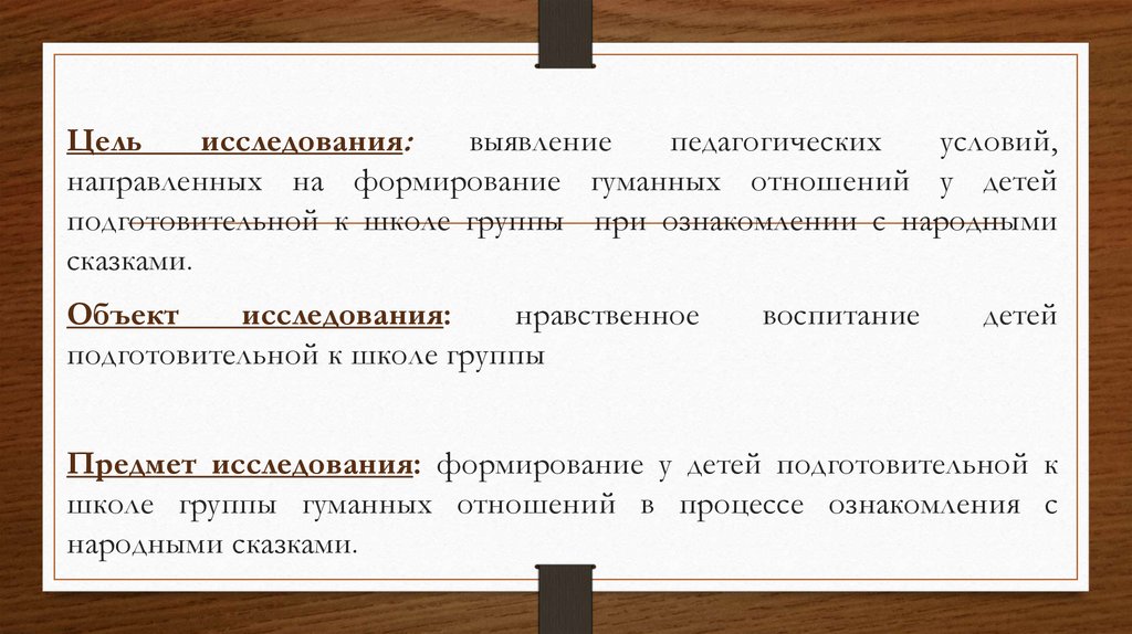 Предмет исследования: формирование у детей подготовительной к