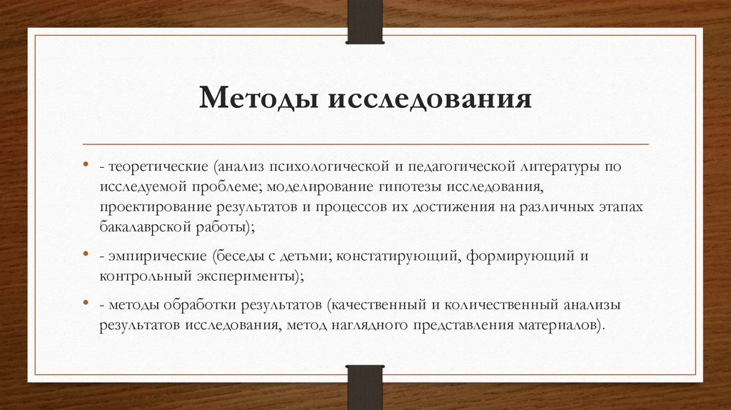 Методы исследования• - теоретические (анализ психологической и педагогической литературы по