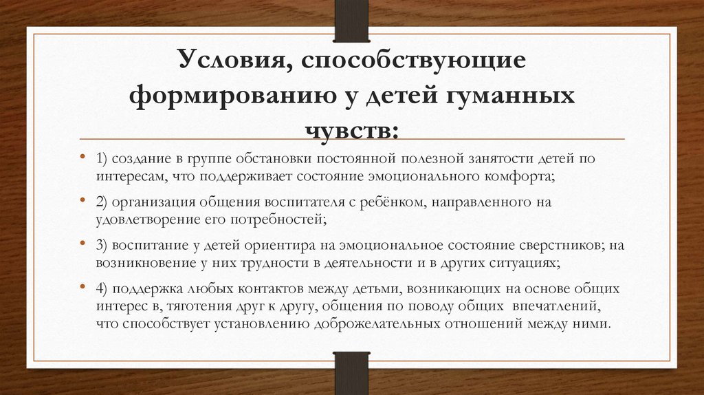 Условия, способствующиеформированию у детей гуманных