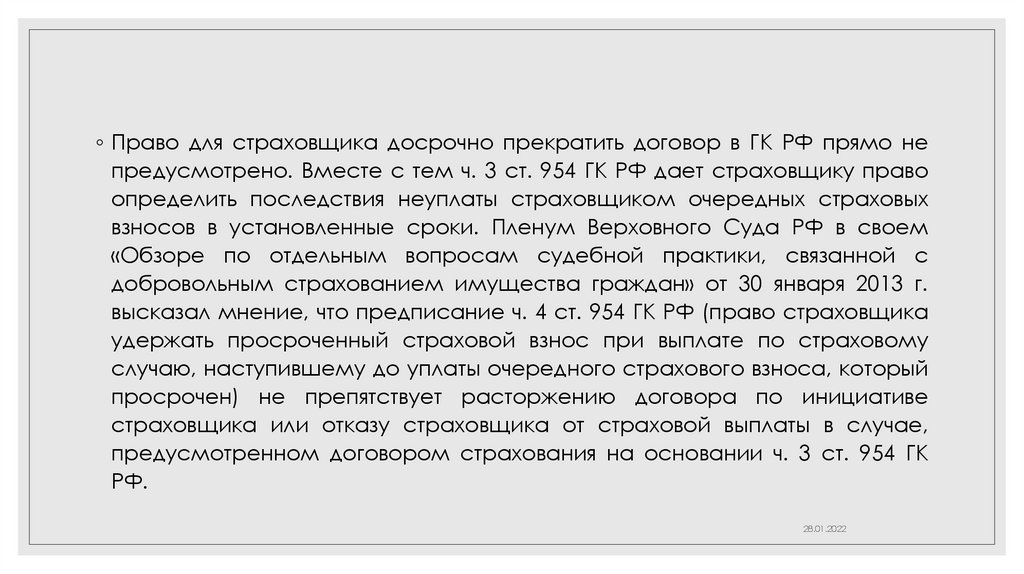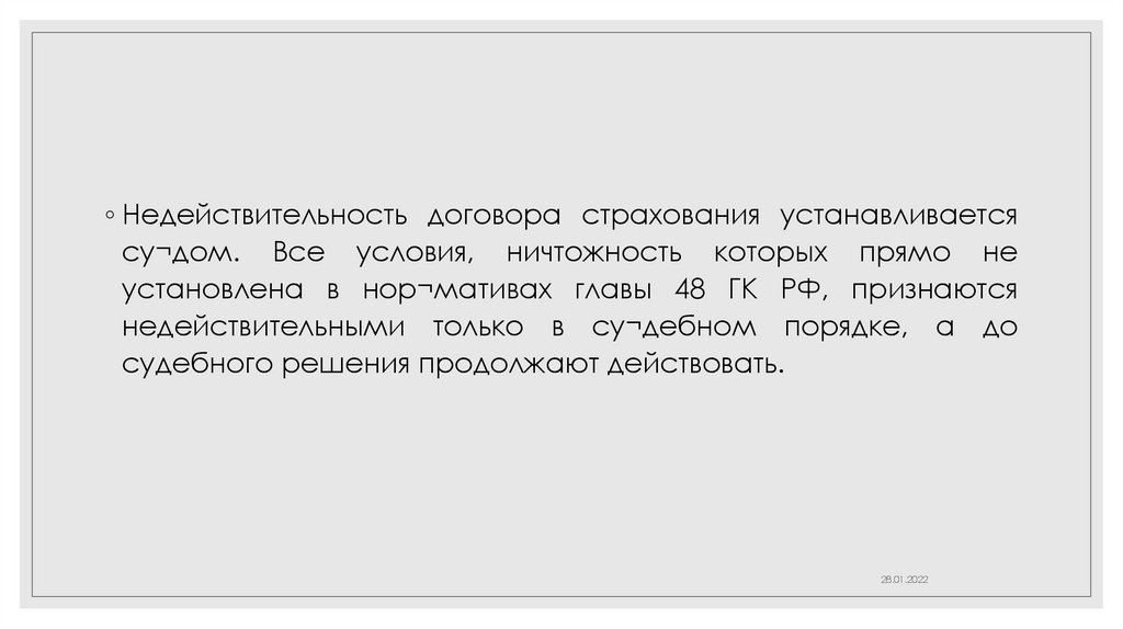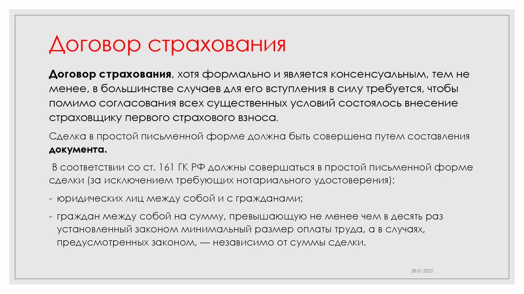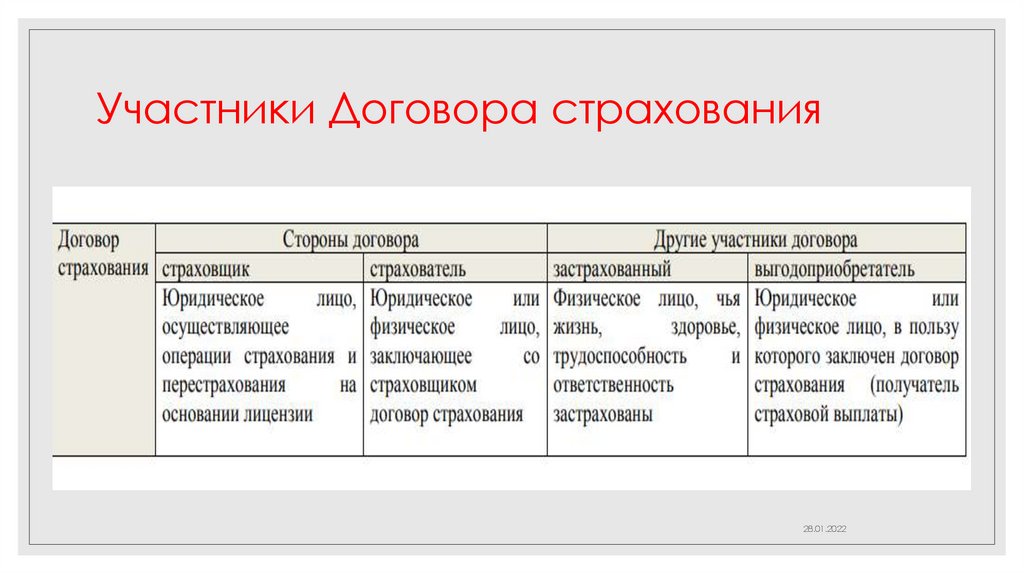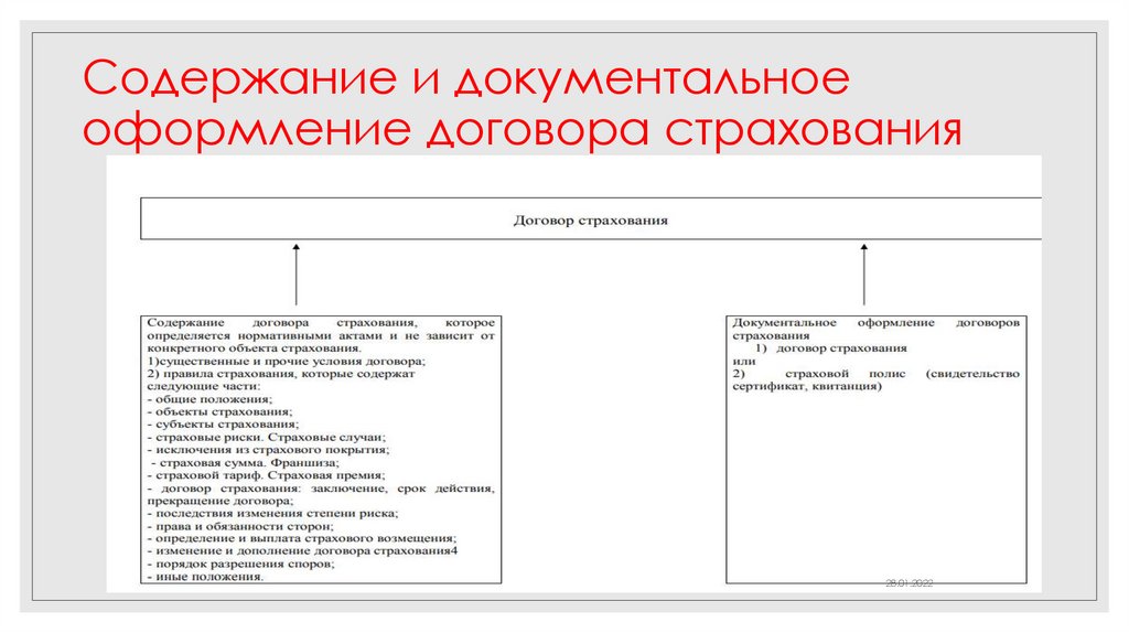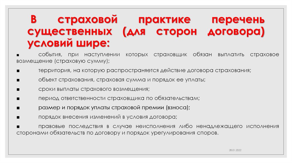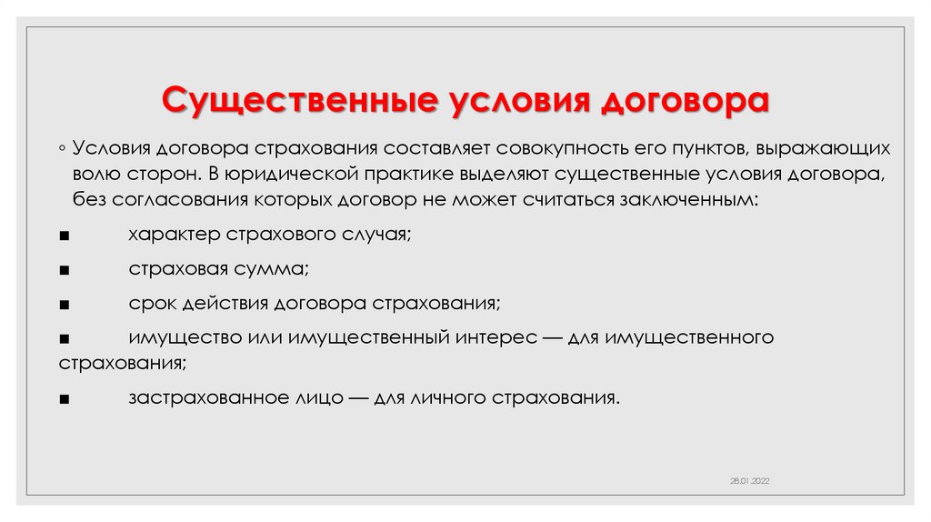 Существенные условия договора◦ Условия договора страхования составляет совокупность его пунктов, выражающих