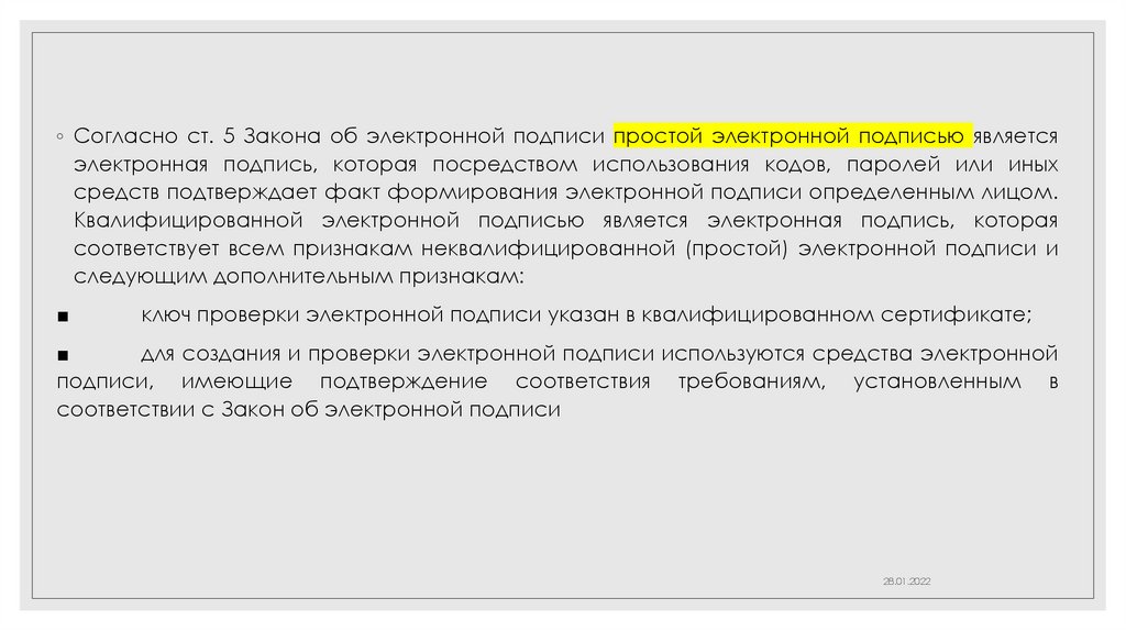 ◦ Согласно ст. 5 Закона об электронной подписи простой электронной подписью являетсяэлектронная подпись, которая посредством использования кодов, паролей или иных