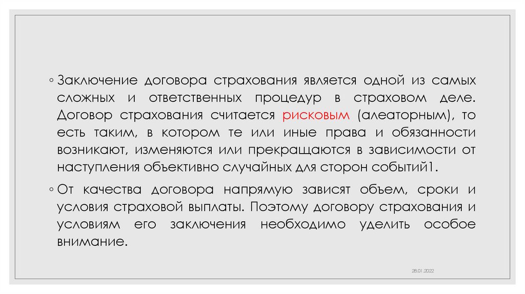◦ Заключение договора страхования является одной из самыхсложных и ответственных процедур в страховом деле.